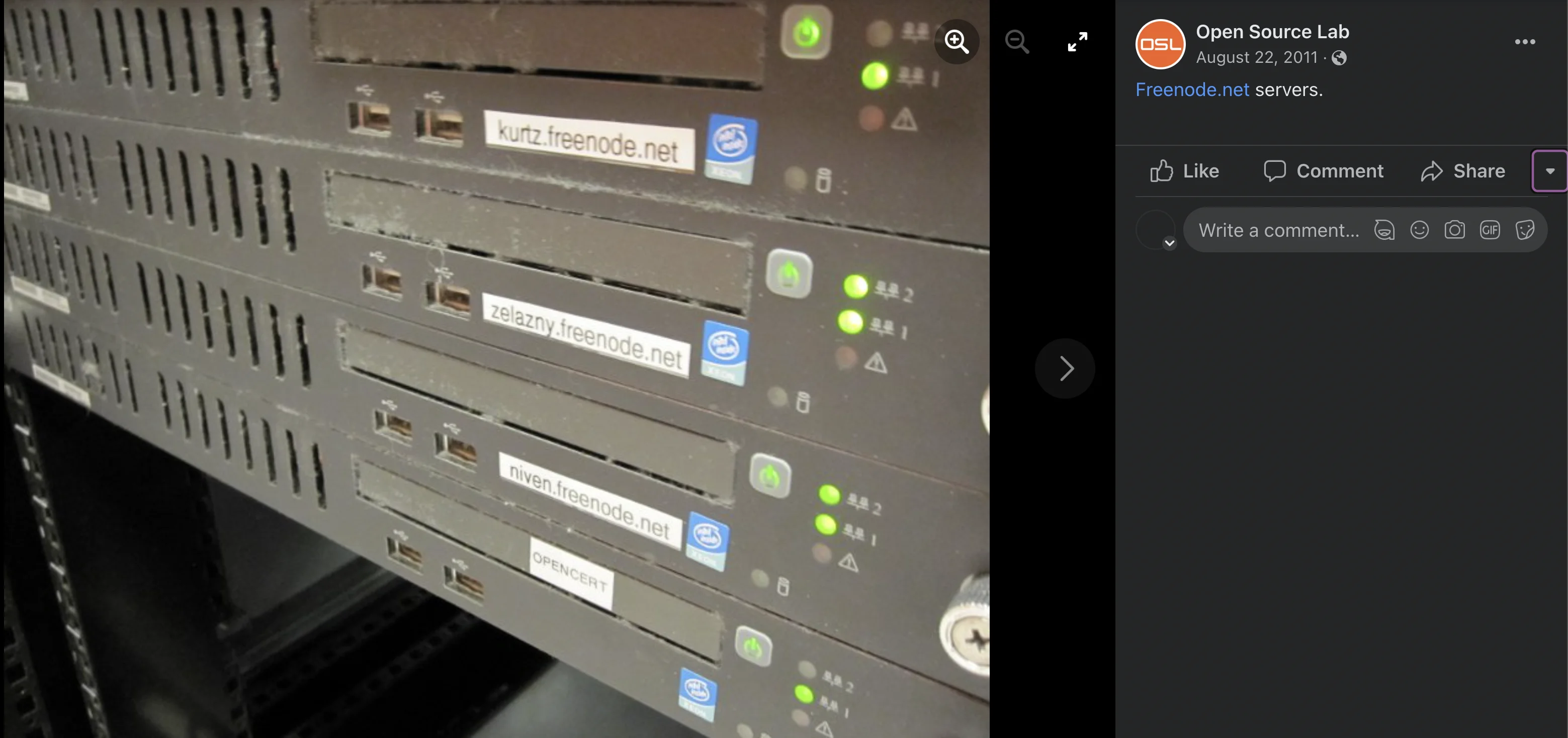 In October 2018 I was at a surplus sale at Oregon State University, a bi-weekly event I often attended when I lived in the area. One day they added a pallet of servers for sale, all e-waste, but among them one stood out: a single HP DL140. Like the rest, it had a hostname sticker on it, but this one was different. Rather than the typical hostnames like “yin”, “yang”, “beaversource” and the like, this one was recognizable: in its past life it was “zelazny.freenode.net”. It had been part of one of the most well known IRC networks in history.