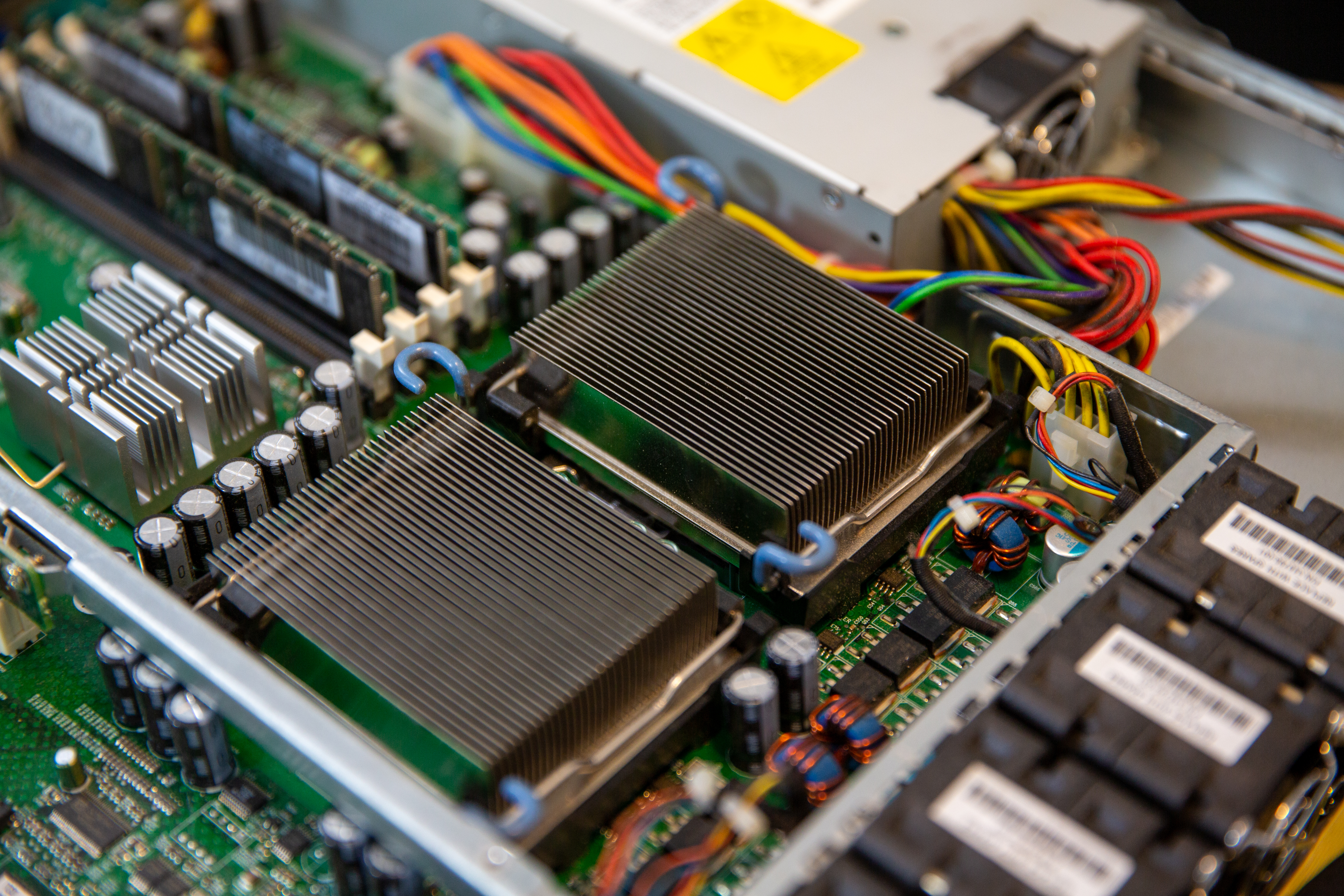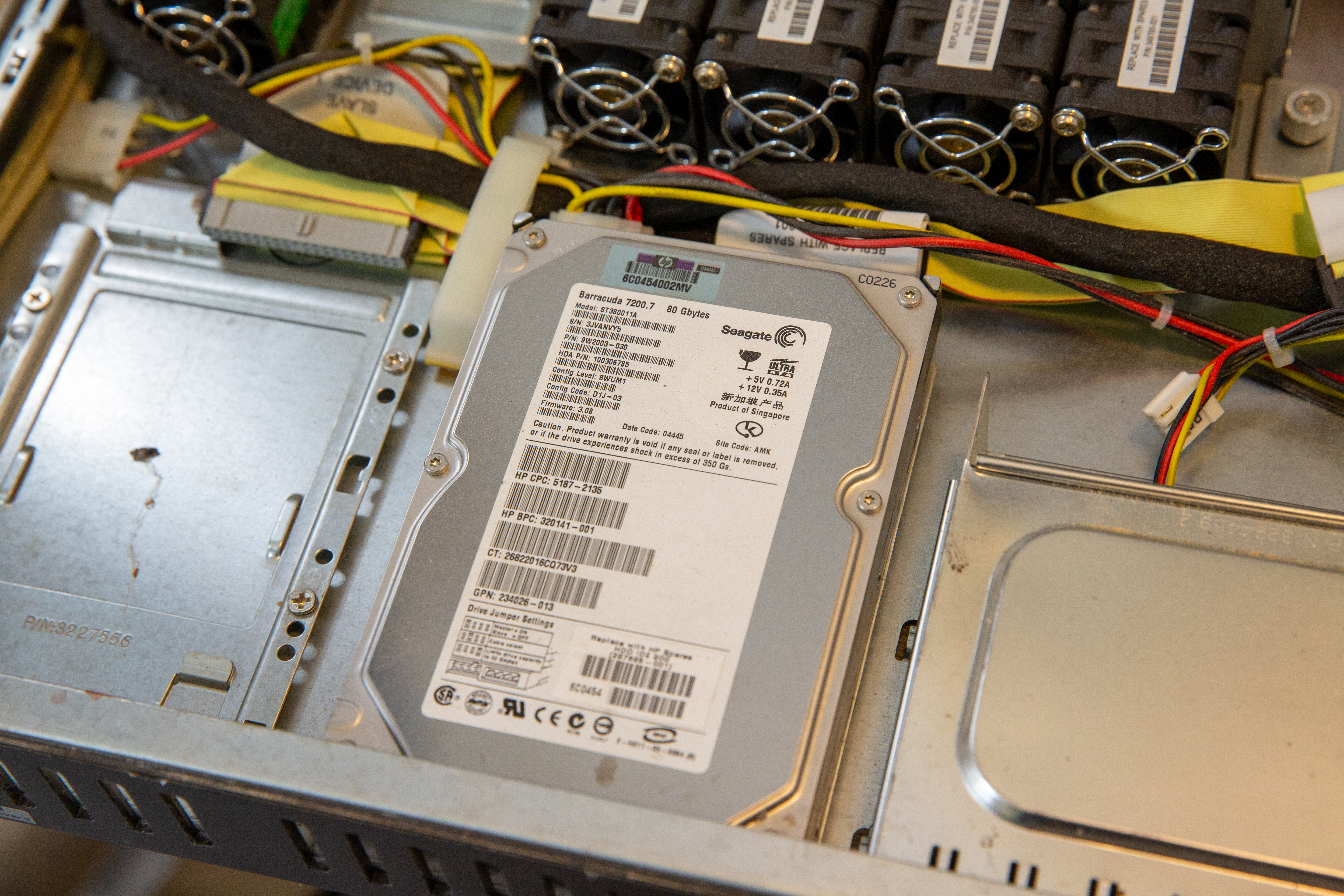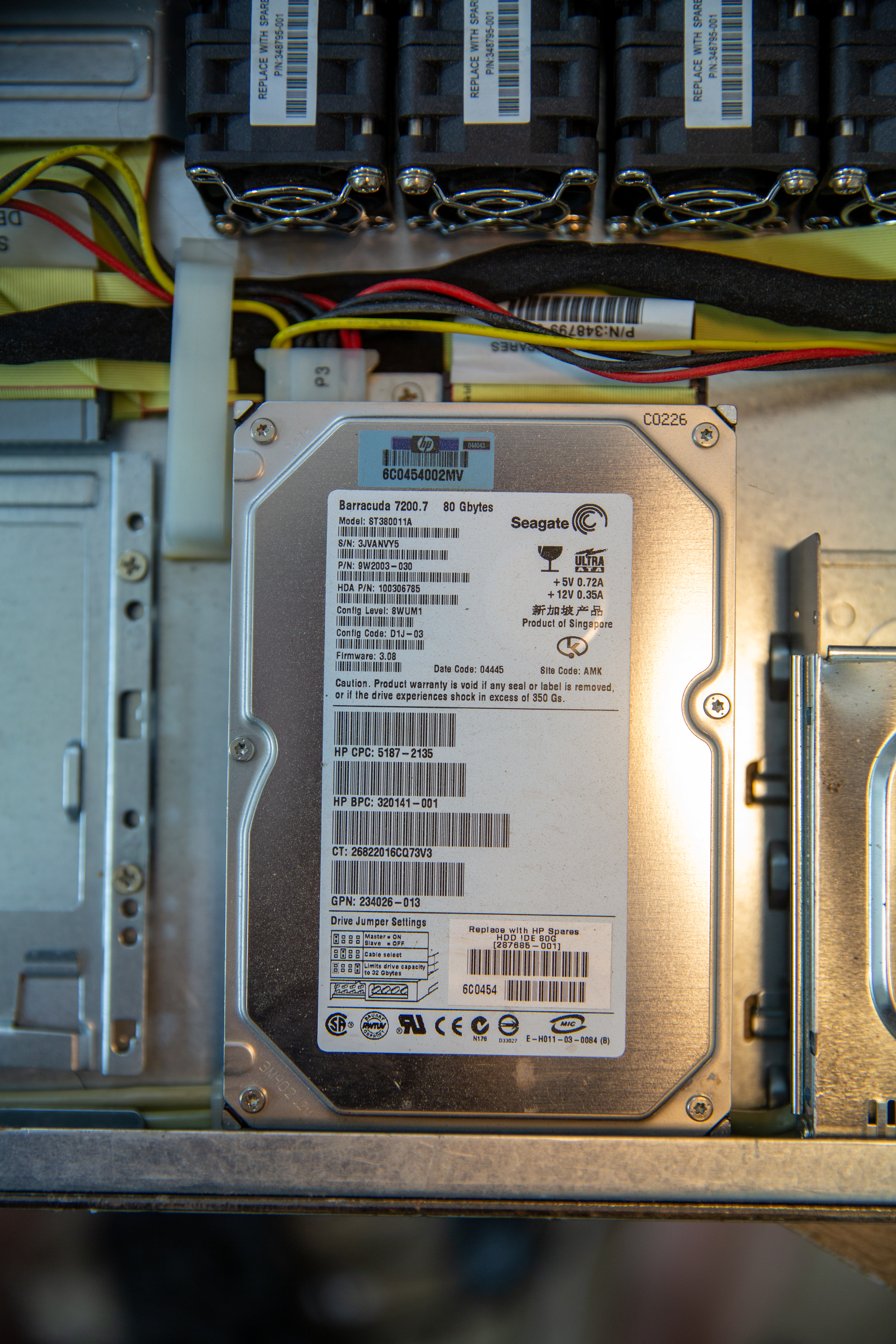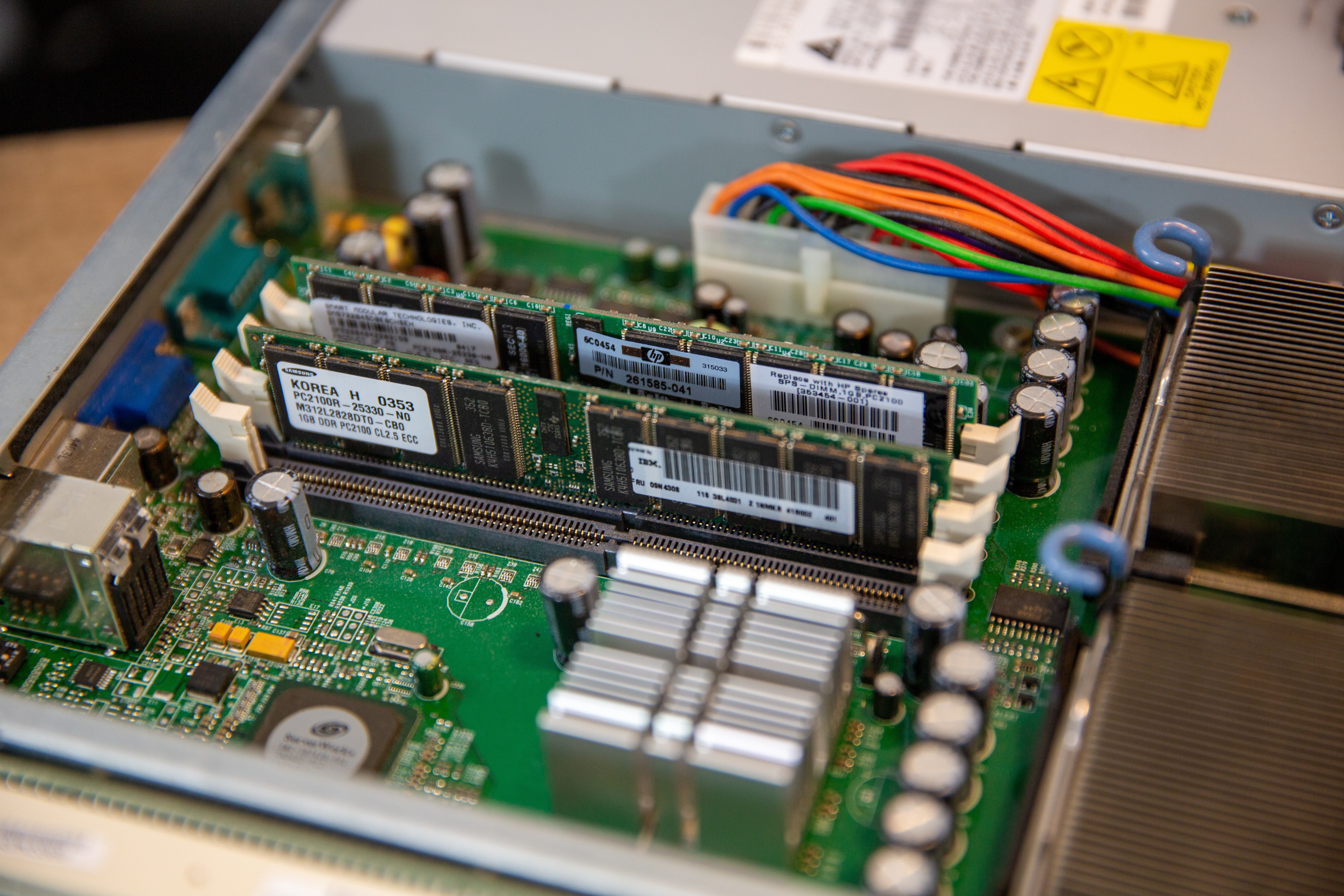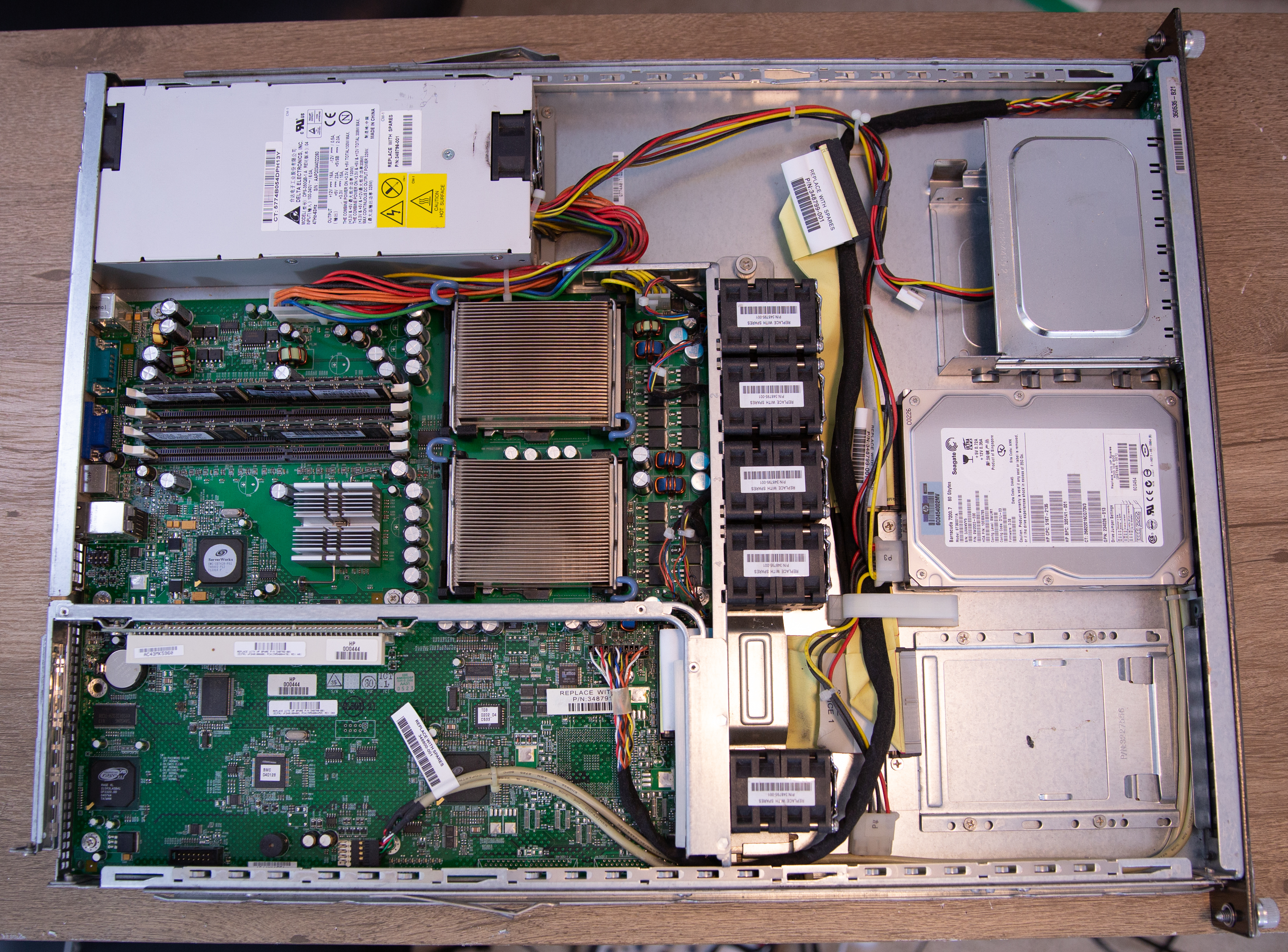 It shipped from HP with 2x 2.4GHz Intel Xeon single-core processors and either 1GB or 2GB of memory. One of the memory modules is branded by IBM and appears to have been added after the fact or was replaced due to module failure.
